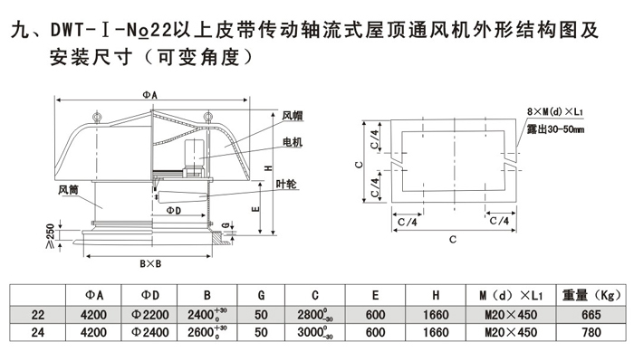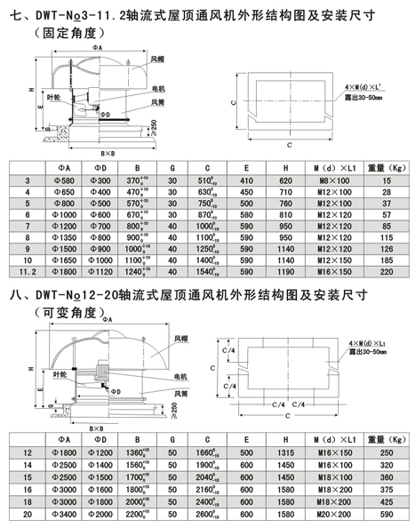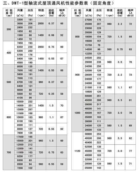③混流式屋顶风机(DWT-Ⅲ),直径自Φ280-Φ800 mm,共十种机号,还可根据用户需要提供其它机号风机。
